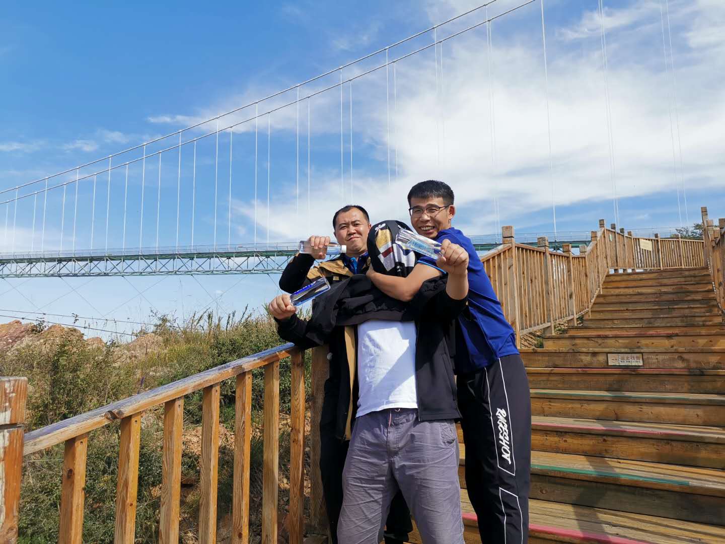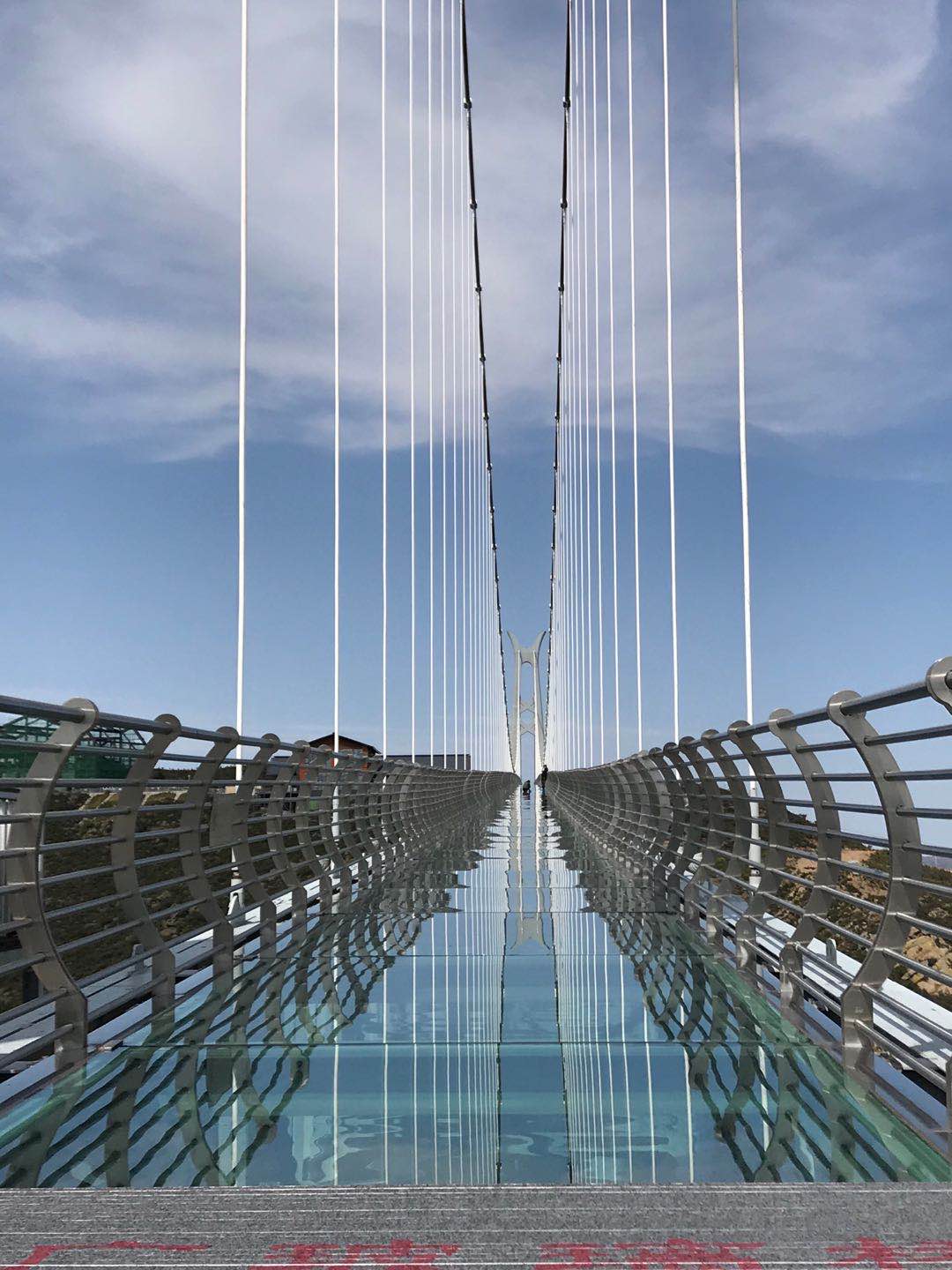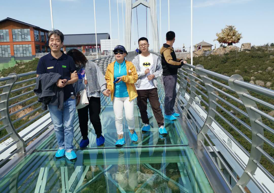 14日下午游覽車載著一行人行駛在山間的小路上,清風徐徐,好不愜意,接著迎來了全長639米的玻璃棧道挑戰(zhàn),驚心動魄,姿態(tài)百出。